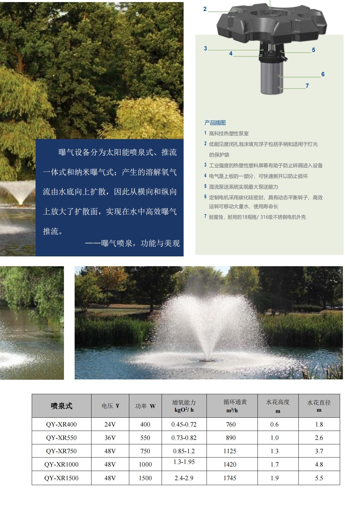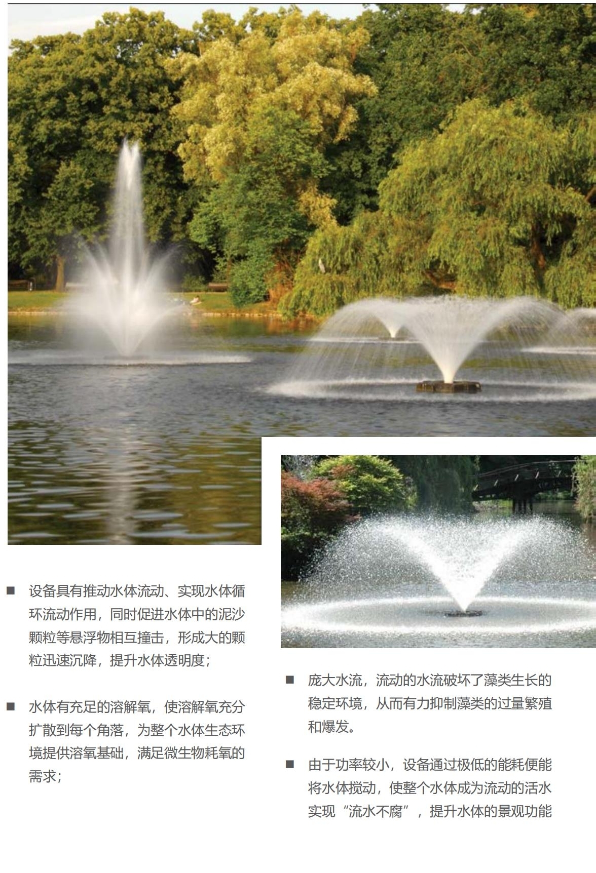 高效混合推流曝气技术通过连续给水体推流加氧,加快水体自然处理营养物质和消除有害气体(氨和硫化氢)的能力,控制水体杂草和藻类的生长。其产生的小水泡因表面张力而将底部的水带到表面,由此产生了一种连续的层流循环,连续层流循环和加氧过程将二氧化碳从碳酸中分解出,并将其带出水面散发到大气中,最终导致水中的PH值增加,水底的氨气也同样被带到水面散发到大气中,从而控制过量水生杂草和藻类生长的营养物质磷、氮和二氧化碳,防止持续厌氧条件下不良有毒气体、硫化氢、甲烷和氨的形成以及增加水底微生物活性,加速有机物的分解,增加鱼类食物、水生幼虫和昆虫,使水生物更健康,植物生长更快更大。